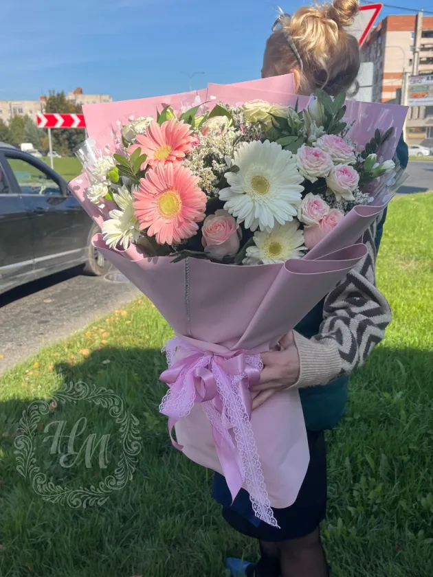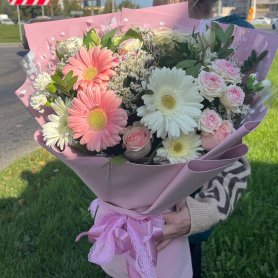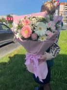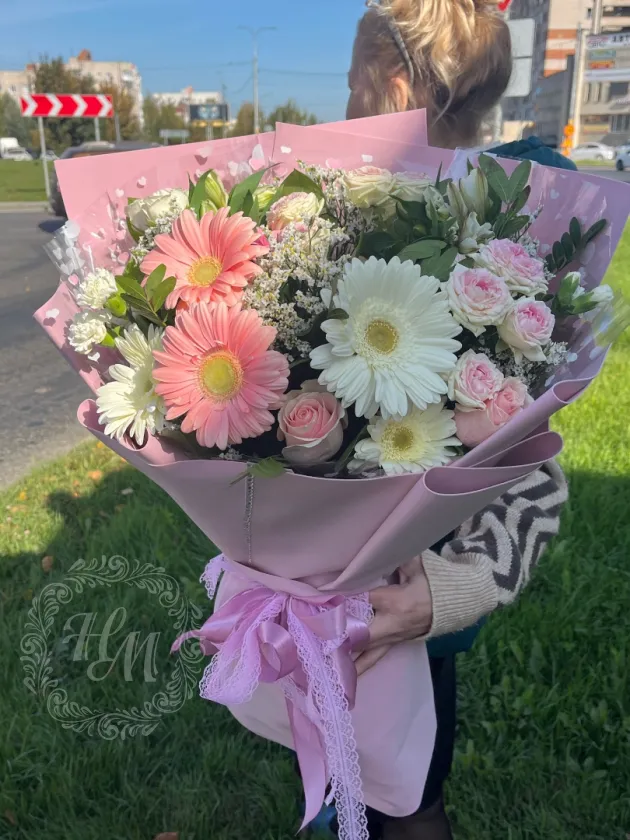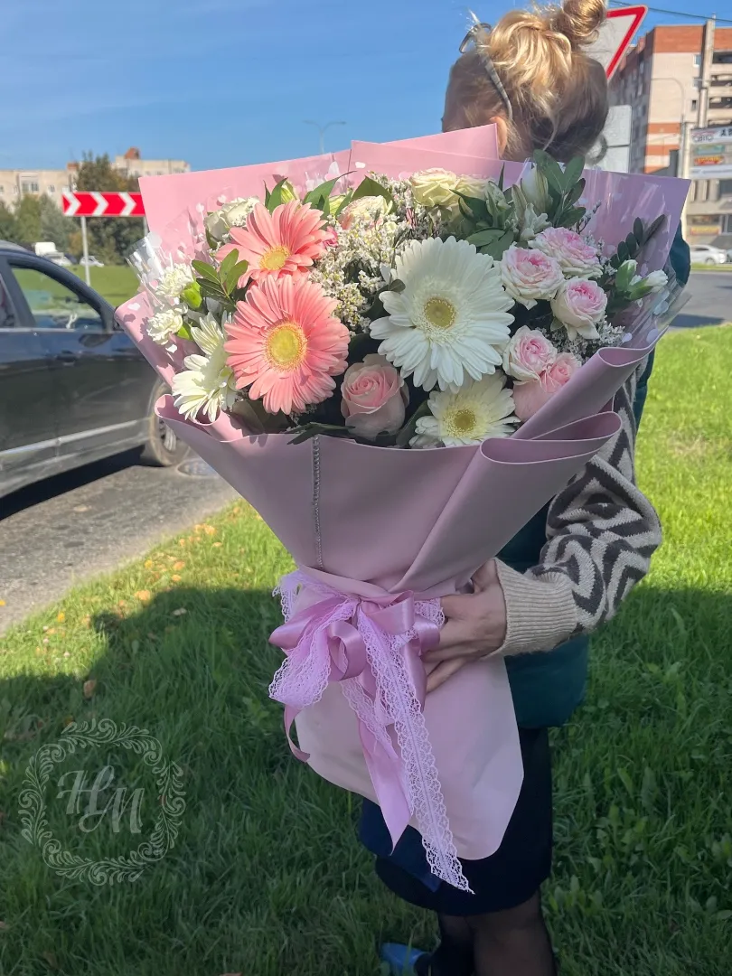 Основной цветок герберы, далее флорист составим букет из наличия свежих цветов