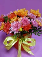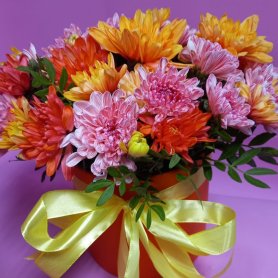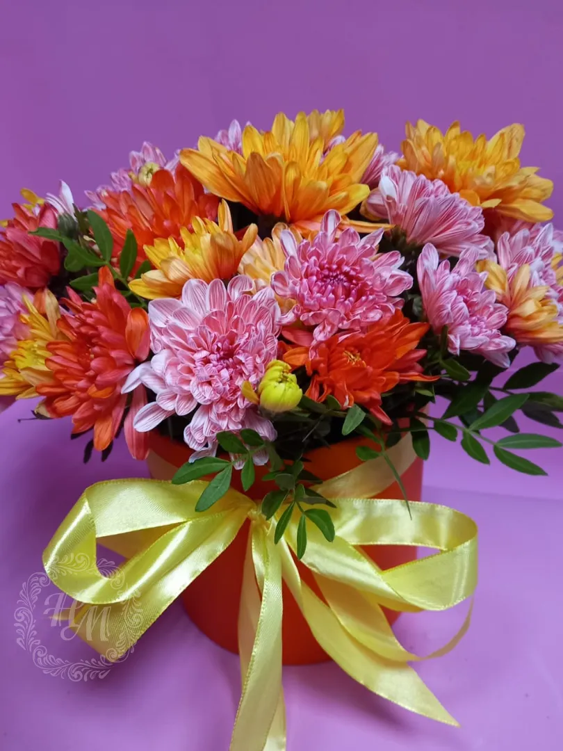 Олнечный закат (красно-желто-аранжевве хризантемы в шляпной коробке) ы