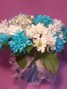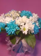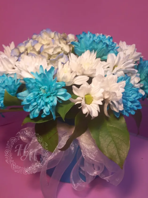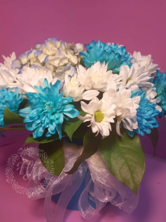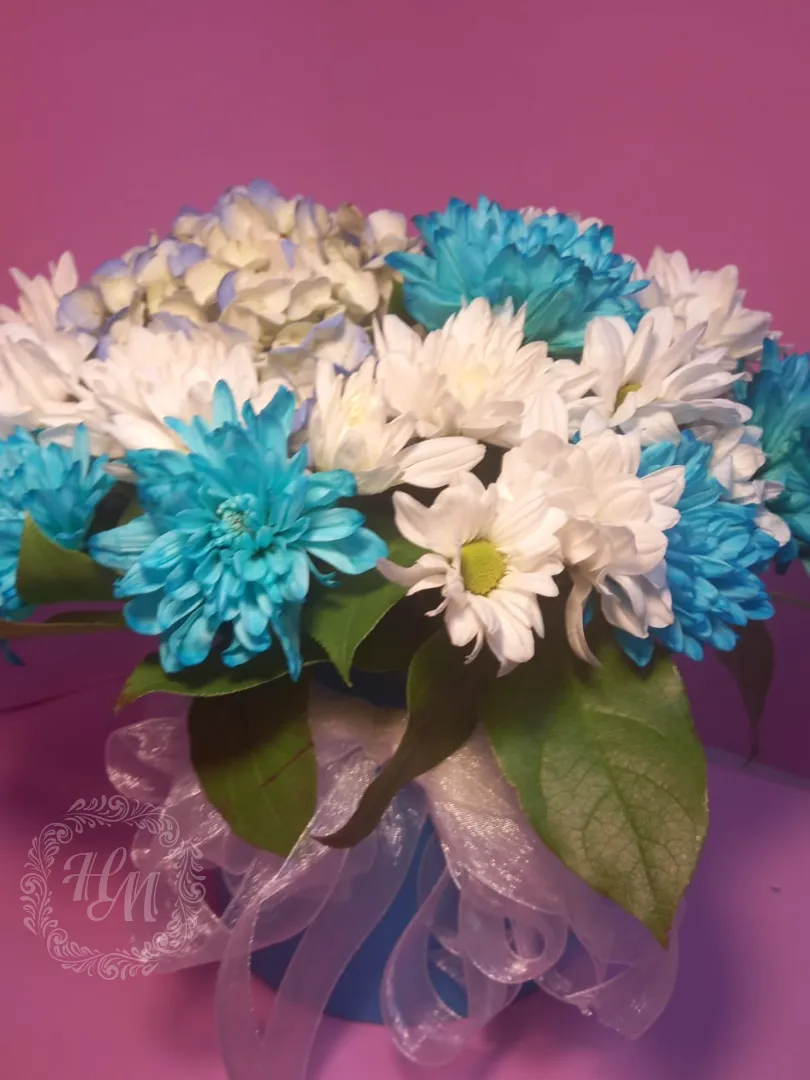 Гортензия и хризантемы в голубой шляпной коробке