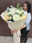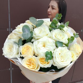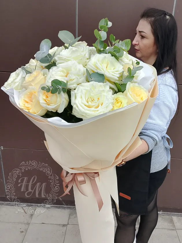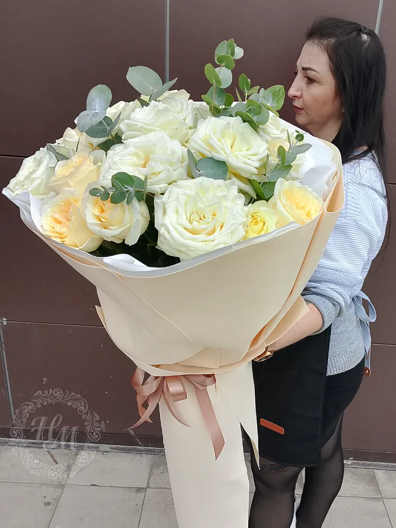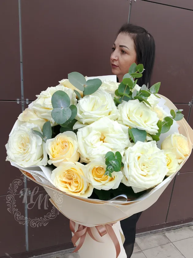 15 белых роз сорт Конделайт с эфкалиптатом упаковка фомиран по кругу