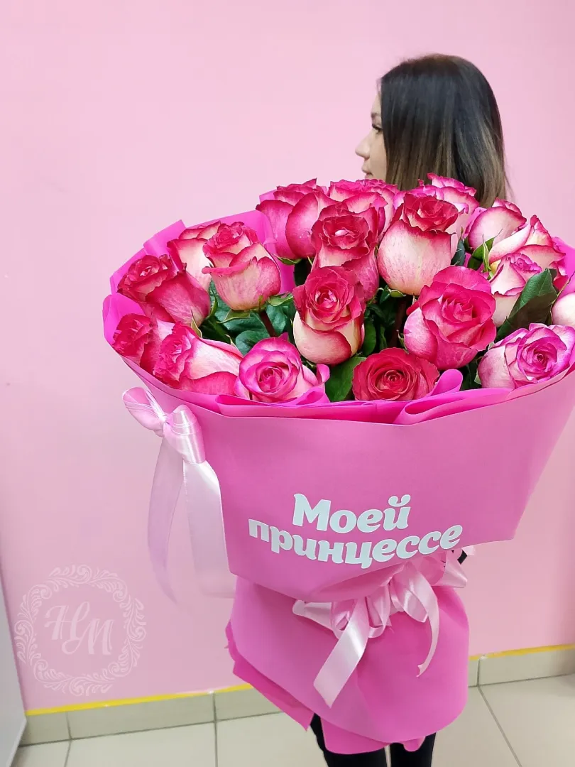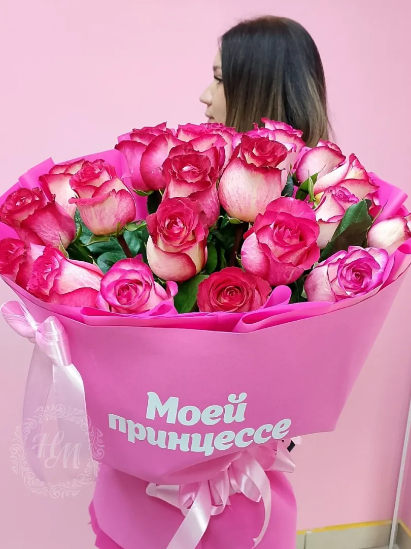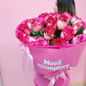 15 розоаых роз, упаковка фомиран, наклейка моей принцессе